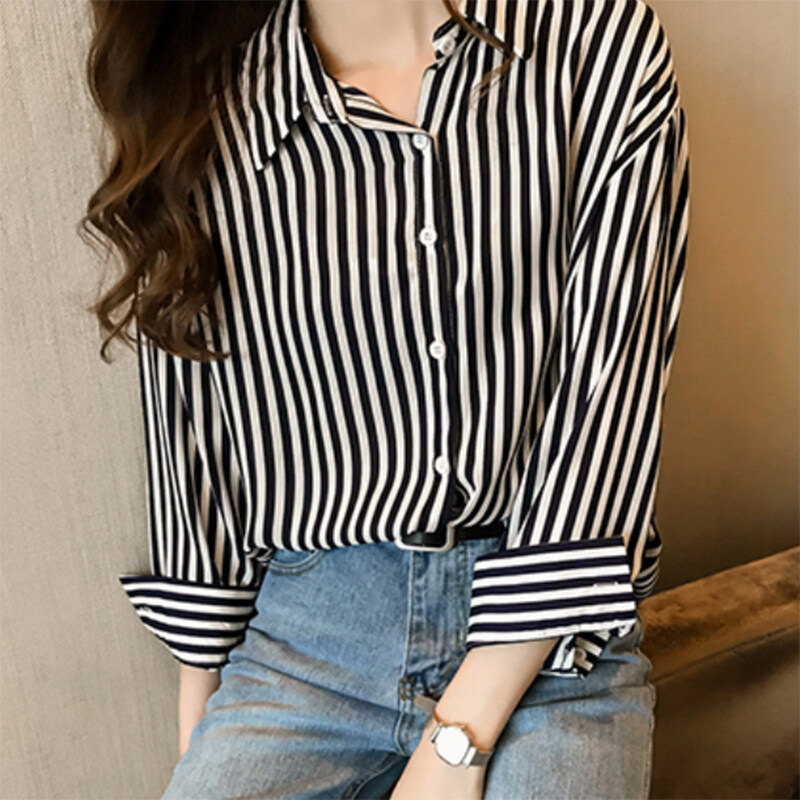 Vanessawang Korean Women Plus Size Blouse Stripe Loose Slim Casual V Collar Buttons Shirt