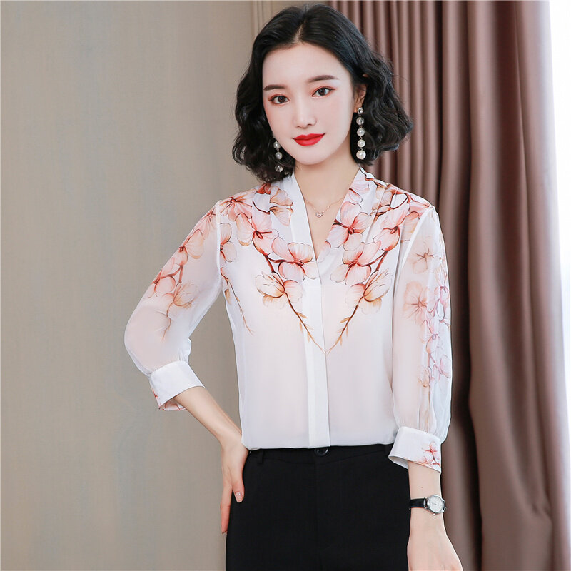 AFEG Korean style women's 3/4 sleeves V-neck printed temperament blouse for women