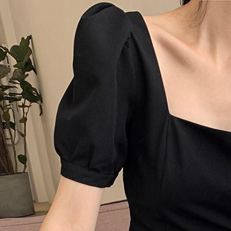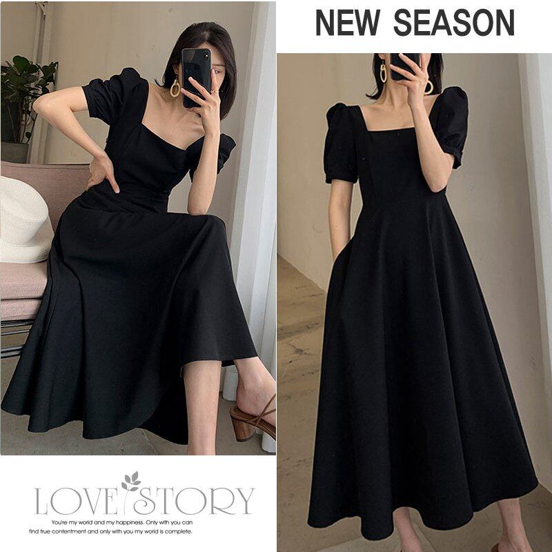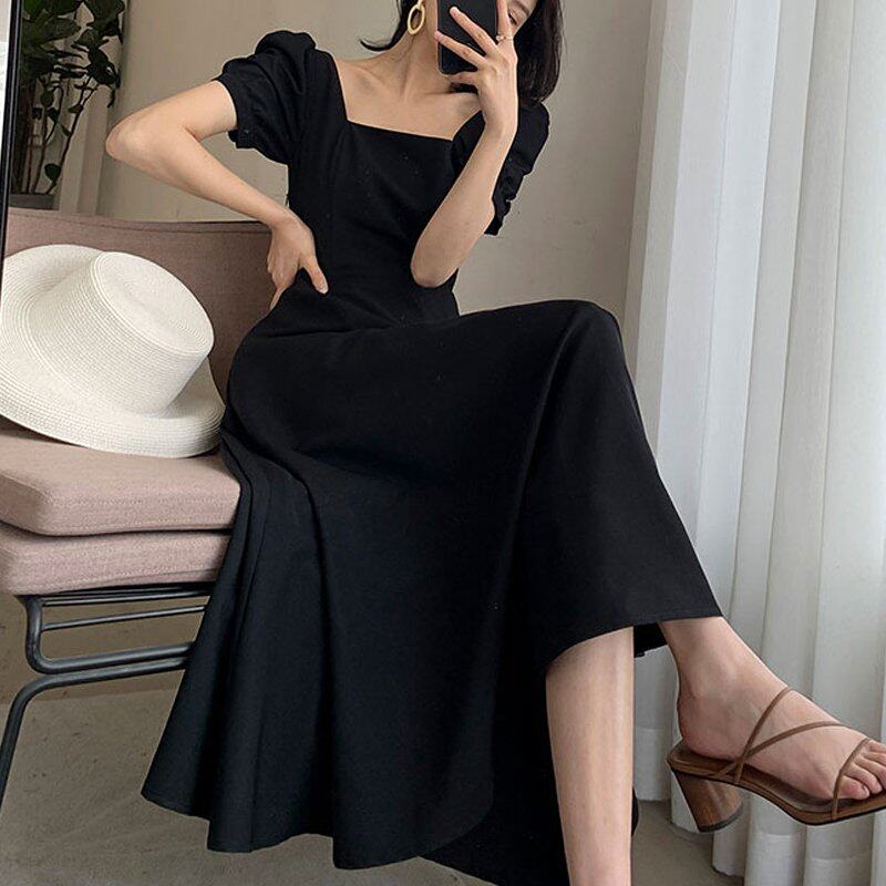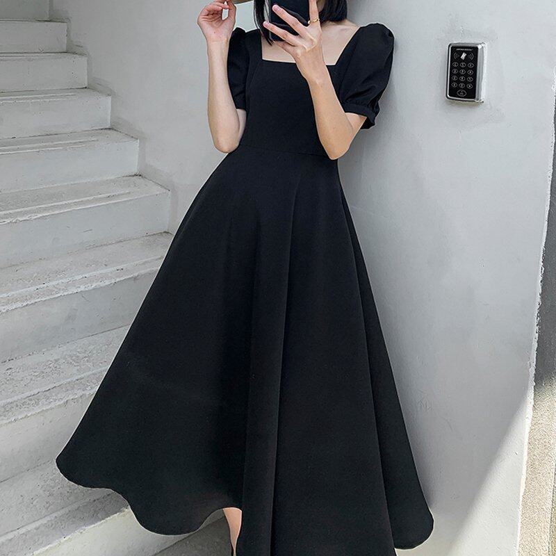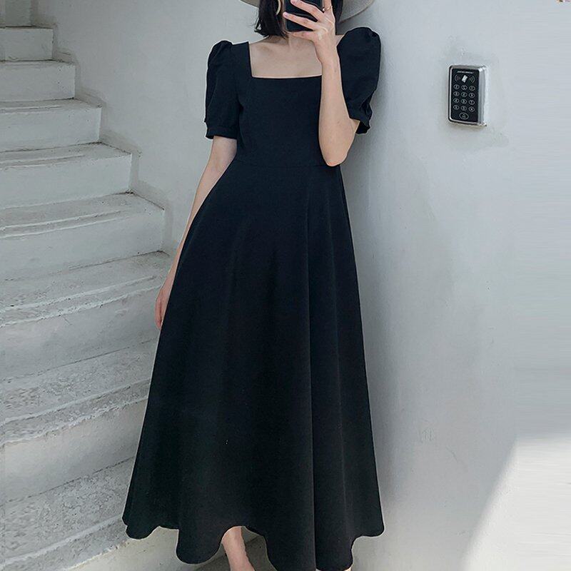 INWPLLR Women's Dress Fashion Plain Dress Elegant Casual Square Collar Short Sleeve Dresses Female Summer Style Long Dress