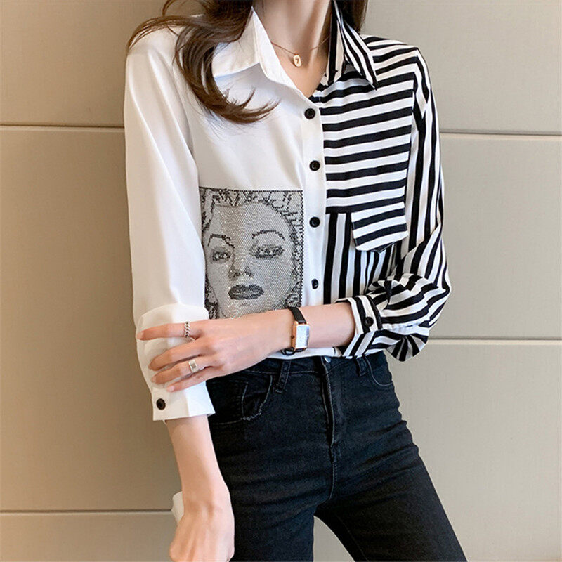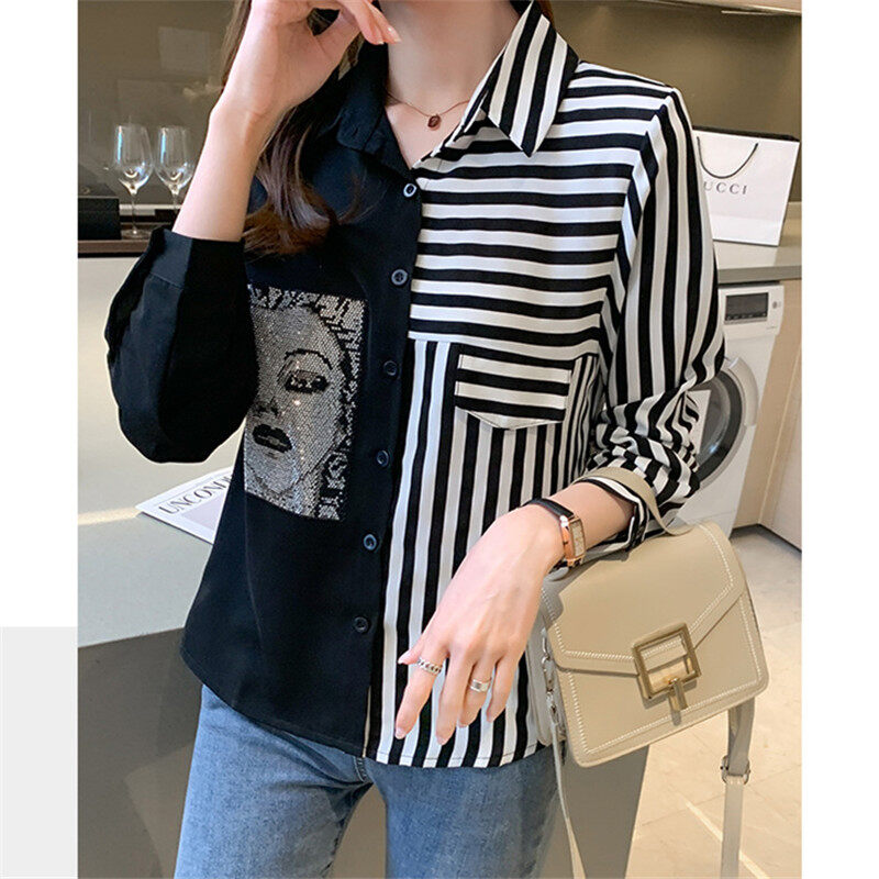 Vanessawang Korean Women Plus Size Blouse Stripe Loose Slim Casual V Collar Buttons Shirt