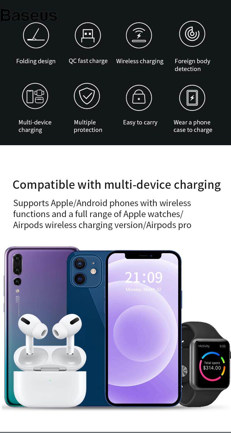 Baseus X455 Foldable 3-in-1 15W Wireless Charger Desktop Qi Fast Charging Stand Dock for iPhone Android iWatch AirPods