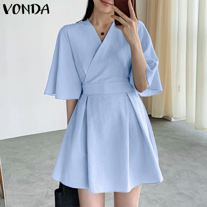 VONDA Women Short Sleeve V Neck Holiday Tunic Dress Fashion Pleated Party Mini Dresses (Korean Causal)