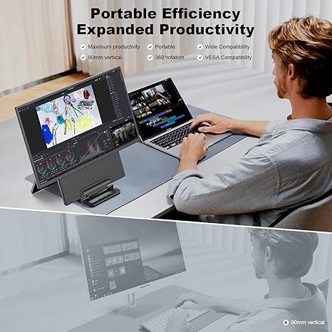 • 【VESA-Compatible & Adjustable Kickstand】The VESA-compatible and 90°adjustable kickstand features an integrated design, making this travel monitor for laptop a convenient travel companion for laptops, gaming consoles, and phones. Use it as a second screen to improve your work efficiency and simplicity.