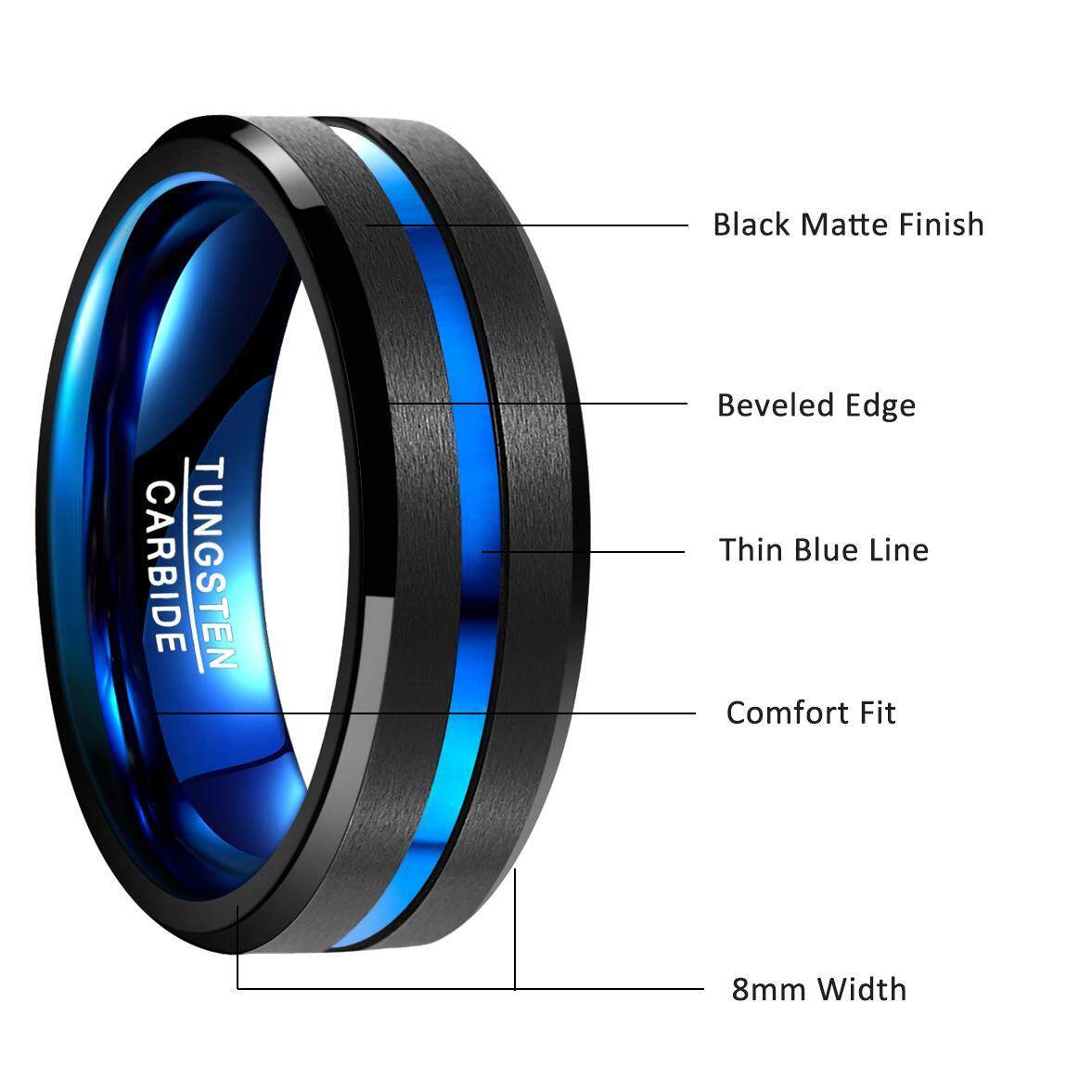 AVECON 【Support Engrave】8MM Tungsten Carbide Ring Balck and Blue Domed Brushed Finish