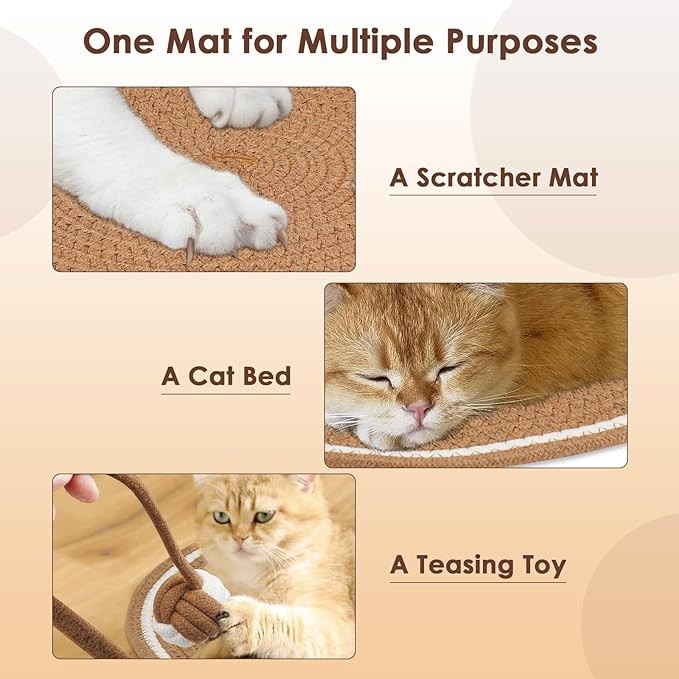 • Safe and Non-Toxic: Our new design cat scratcher mat is hand-made from 100% natural cotton rope material, the scratching surface is chemical-free, eco-friendly and non-toxic, ensuring the safety of your cat and the environment.